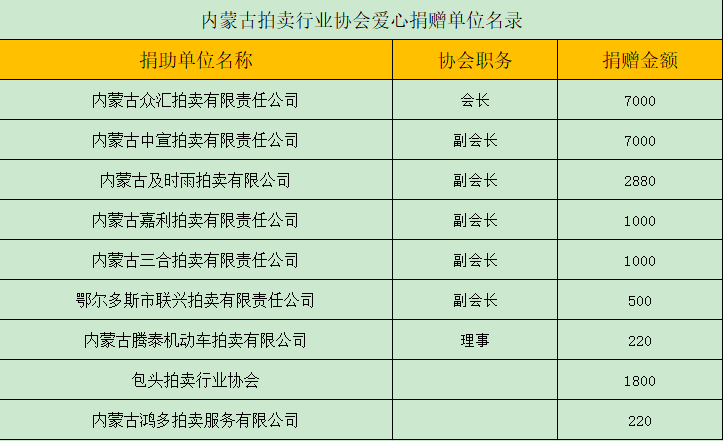 內(nèi)蒙古拍賣行業(yè)協(xié)會(huì)向額濟(jì)納旗紅十字會(huì)捐贈(zèng)物資、防疫基金 的公示名錄 自協(xié)會(huì)2021年10月29日發(fā)起《關(guān)于防疫物資捐贈(zèng)的倡議書》后,收到了我區(qū)多家拍賣企業(yè)捐贈(zèng)的物資和防疫資金。本次捐贈(zèng)活動(dòng)于2021年11月12日中午12:00結(jié)束。 現(xiàn)向社會(huì)各界公示愛心捐贈(zèng)單位名錄: