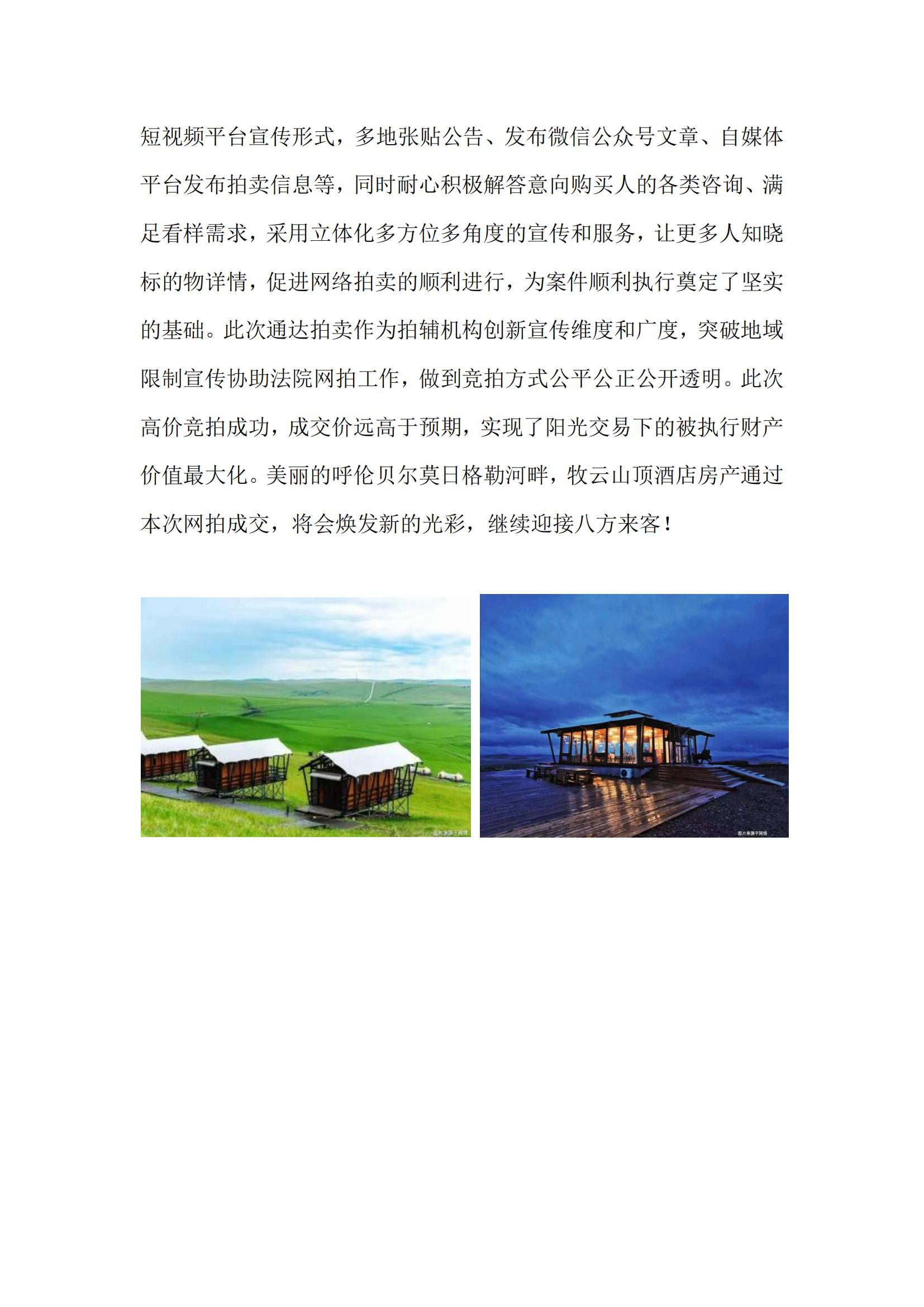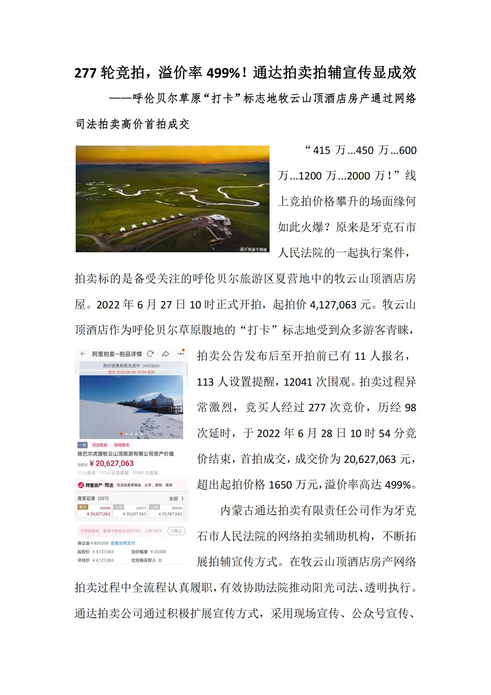 專業(yè)拍賣機構,助力司法拍賣 我區(qū)拍賣企業(yè)開始入圍法院司輔機構已經兩年有余,在入圍的這兩年多時間里,拍賣企業(yè)作為專業(yè)的拍賣機構不斷的完善自身,利用我們的專業(yè)助力司法拍賣,提高司法拍賣的成交額。拍賣企業(yè)的專業(yè)就是拍賣,作為司法輔助機構,我們拍賣企業(yè)更能夠從委托方角度出發(fā),從標的角度出發(fā),從競買人的角度出發(fā),深刻的了解各方的切實需求。也更可以找到標的的亮點從而非常專業(yè)的對其進行宣傳,通過拍賣企業(yè)本身的客戶資源以及通過網站、公眾號、宣傳視頻等多種新的宣傳自媒體齊發(fā)力,已經突破了地域限制,使得更多的潛在買家可以看到和了解標的。同時專業(yè)的拍賣公司有著強大的拍賣實力和風控能力,對于拍賣過程中出現(xiàn)的問題以及未出現(xiàn)的問題都會做到提前準備預案,這樣為標的的最后成交奠定了專業(yè)而扎實的基礎。因為術業(yè)有專攻,讓專業(yè)的人做專業(yè)的事更能讓他們發(fā)揮所長,讓價值得到最大化,也能盡快的找到解決辦法,從而節(jié)省成本。 昨天收到來自內蒙古通達拍賣有限責任公司的好消息,位于呼倫貝爾草原“打卡”標志地的“牧云山頂酒店”房產網絡司法拍賣通過該企業(yè)的輔助宣傳,網絡拍賣產生了激烈的競價,經過277 輪競價后,最終以 20,627,063 元成交,溢價率達到 499%。 這便是一個很好的例子,希望我們全區(qū)的拍賣企業(yè)都能充分發(fā)揮自身專業(yè)優(yōu)勢,助力司法拍賣,在這一領域開疆擴土,以此為契機,從點到線再到面的全面發(fā)展。