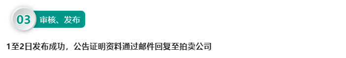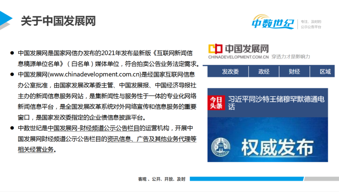 拍賣公告的依法合規(guī)發(fā)布,是拍賣企業(yè)規(guī)范運營、拍賣交易有別于其它交易的重要體現(xiàn)。中國發(fā)展網(wǎng)財經(jīng)頻道在公示公告欄目為拍賣企業(yè)開通了發(fā)布咨詢信息、發(fā)布公示公告的權(quán)限。在中國發(fā)展網(wǎng)發(fā)布公告,符合《互聯(lián)網(wǎng)新聞信息管理規(guī)定》相關(guān)法律法規(guī)要求,與傳統(tǒng)紙質(zhì)媒介具有同等法律效力,并有區(qū)塊鏈存證下載技術(shù)。在網(wǎng)絡(luò)平臺發(fā)布公告還可改善“拍賣公告”傳播范圍和公告信息留存,更預(yù)示著行業(yè)迎來“新風向”。 相較于以報紙為代表的傳統(tǒng)公告發(fā)布渠道,公示公告平臺具有三大優(yōu)勢: 第一,及時便捷。不被發(fā)版時間掣肘,發(fā)布更高效。 第二,版面優(yōu)化與擴大。專有的“公示公告”欄目,讓你的公告更加醒目,形成信息圈層,吸引高質(zhì)量關(guān)注;用圖文混排的形式,讓公告發(fā)揮更大的價值。 第三,即刻分享。每篇公告擁有獨立鏈接,動動小手廣而告之。 專注、及時的公示公告平臺讓拍賣企業(yè)體驗數(shù)智時代的更優(yōu)選擇!